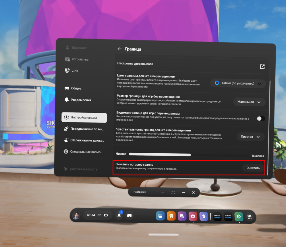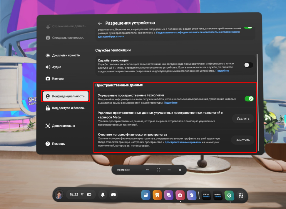 Иногда в шлеме, необходимо очищать историю игровых пространств, для того, чтоб скопленный кэш не забивал оперативную память шлема. Сделать это можно внутри настроек самого шлема Meta Quest.